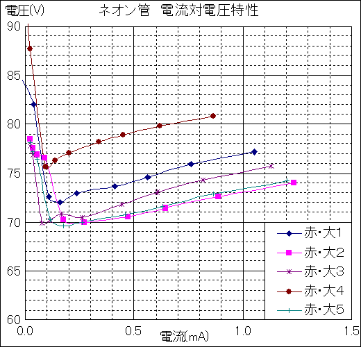 ネオン管の定電圧特性を調べる為にまず5個購入し電流対電圧特性を調べました。その結果の図を次に掲載します。
