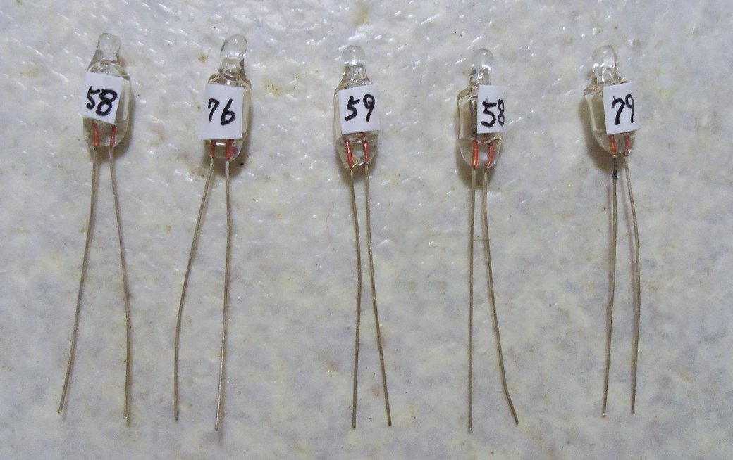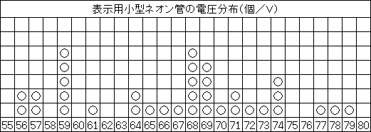 そこで、200V程度の直流電源を使い直列抵抗を接続して微少電流を流し1本1本の電圧を測り、ネオン管にビニールテープを貼って電圧を記入し区別しました。その一部を次に掲載します。