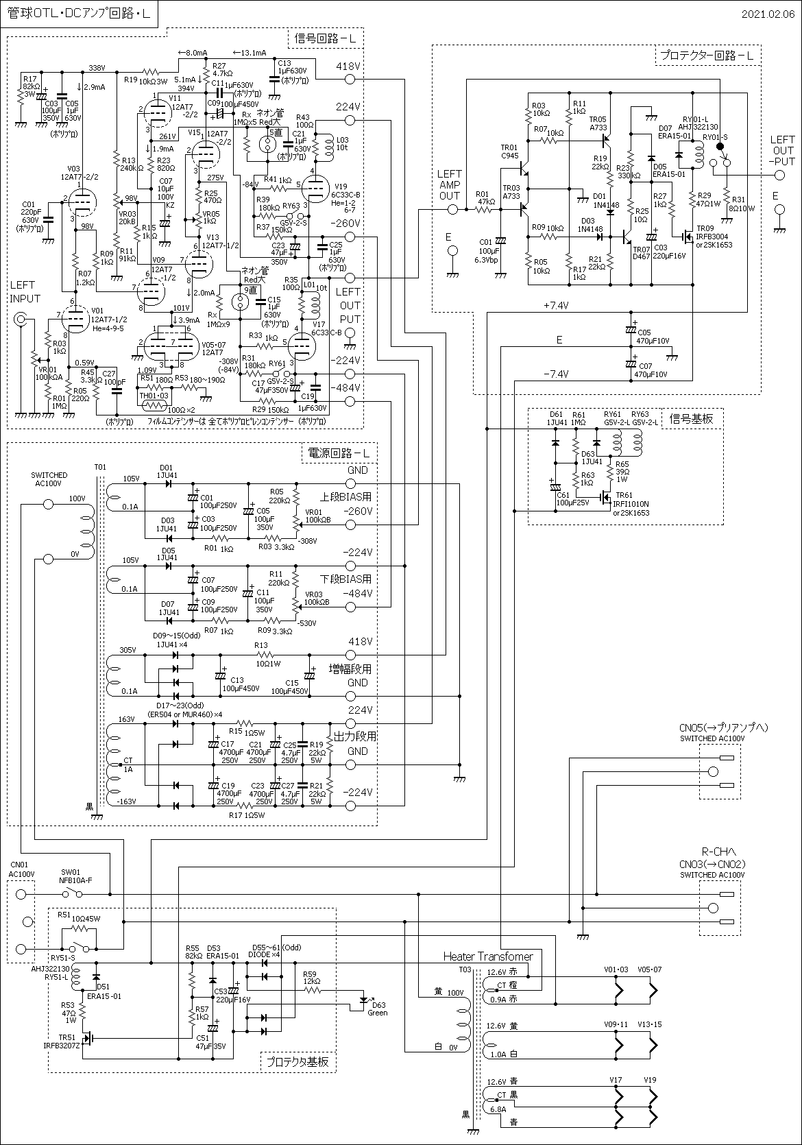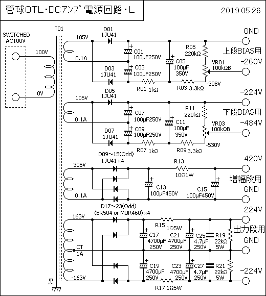 先ず、トランスや大型コンデンサーを含むL−CHの電源回路図を掲載します。