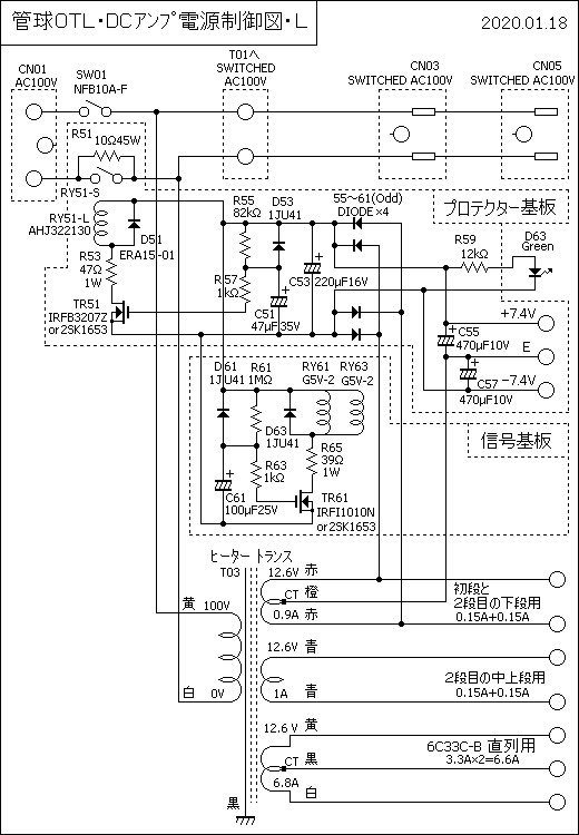次にヒータートランスや突入電流緩和回路とネオン管励起終了回路を含んだL−CHの電源制御図を掲載します。