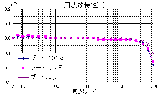 ツェナーダイオードやネオン管を並列してバイアス電流を流して直流まで結合させても良いのですが、NF付加後の仕上りのF特としては100kHz付近を除けばブートストラップの有無で0.1dBの変化もなく、コンデンサーが開放する直流域ではブートストラップではなくなるものの、DCアンプであることに変わりはありません。