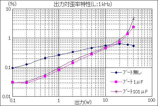 この2点から101μFあれば可聴周波数内の歪率に問題がない事が分かり、同時に直流域や超低周波域でも歪率がやや悪くなる程度の違いであることが分かります。